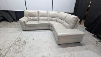 Light grey leather corner sofa in very good condition, professionally cleaned and refurbished. Spacious, comfortable, and ready for fast delivery across Belfast & NI. Includes 7-day warranty.