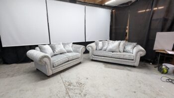 Crushed velvet 3+2 seater sofa set in good condition, professionally washed with upgraded cushions for extra comfort. No rips or tears. 3 seater: 225cm, 2 seater: 185cm. Fast delivery available. Includes 7-day warranty.