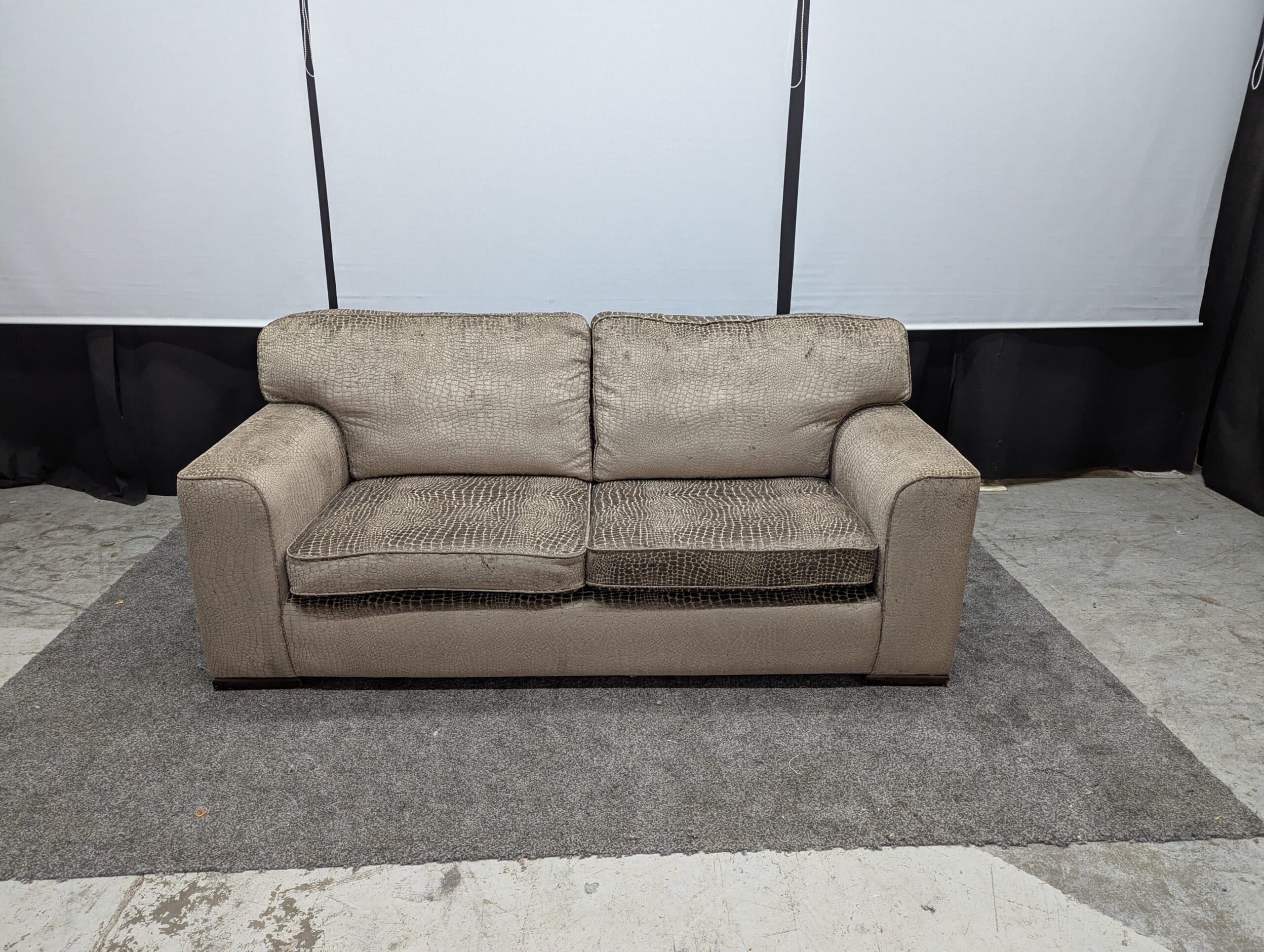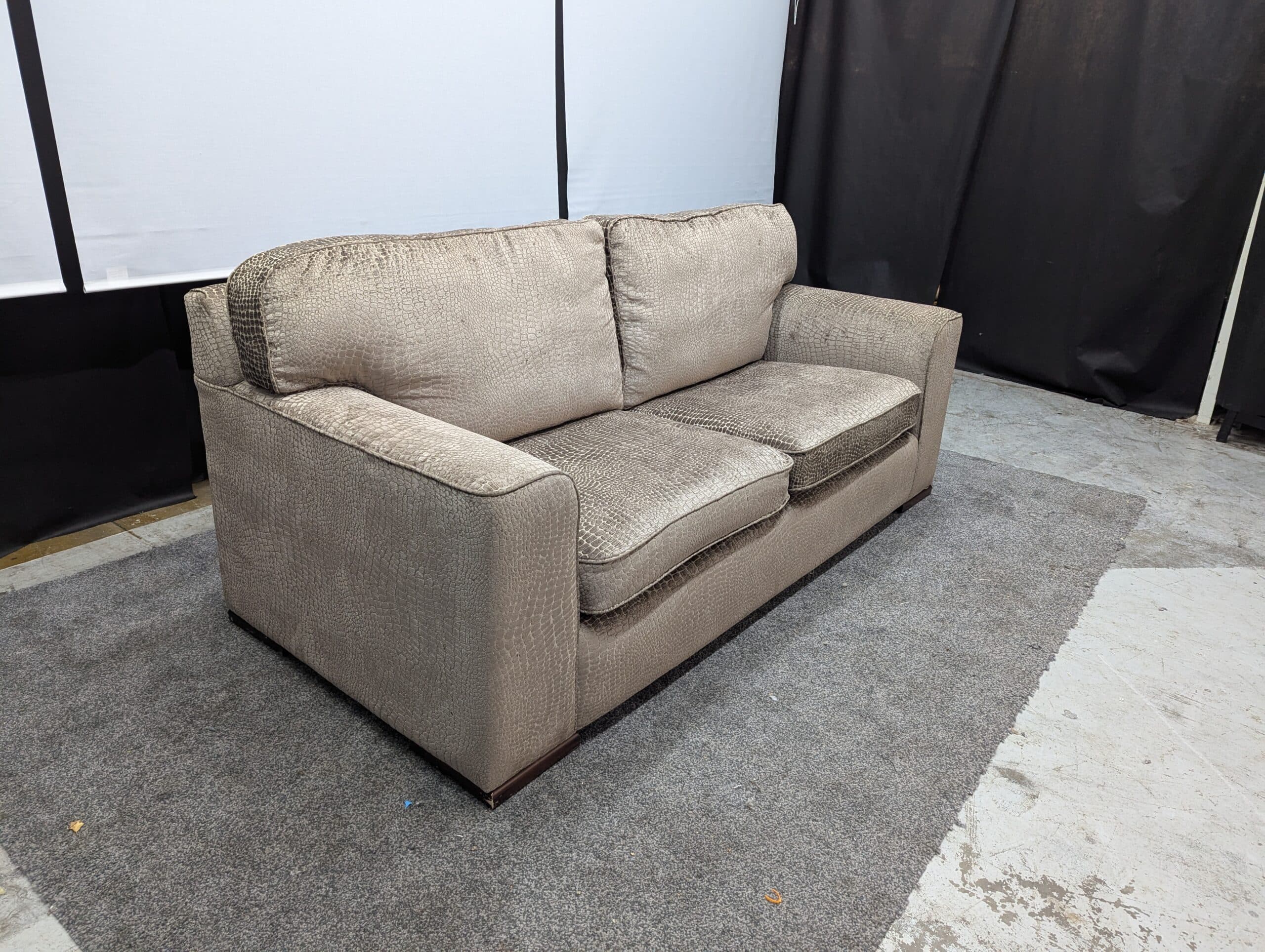 This refurbished 3 seater crocodile skin pattern sofa is a sturdy and spacious model in excellent condition — no rips, tears or damage. It has been fully professionally washed and steam-disinfected, and all seat and back cushions were redone for extra comfort.