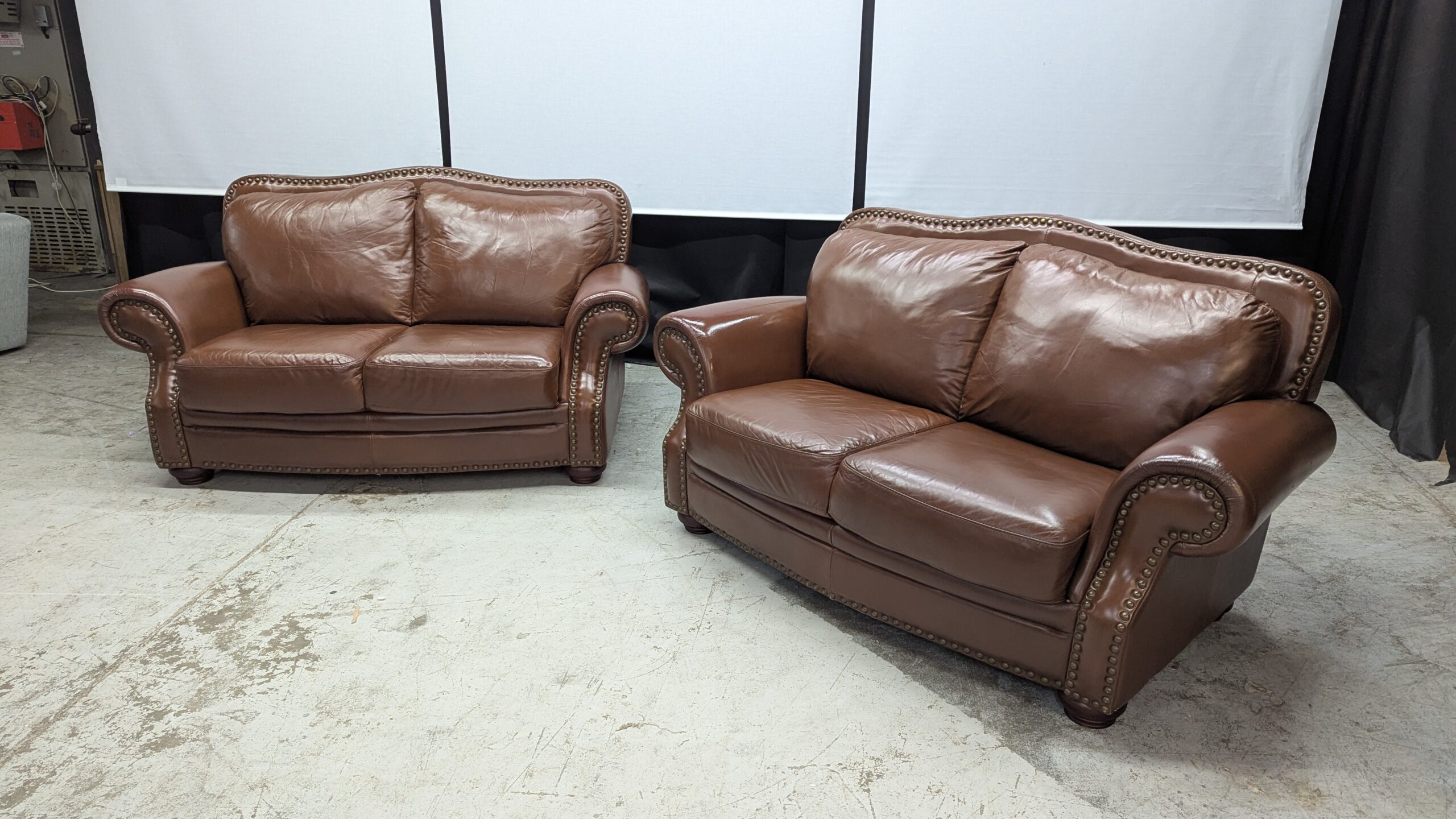The sofas are upholstered in real leather, ensuring durability and easy maintenance. They are in very good condition with no rips or tears, and have been professionally cleaned, so they are fresh and ready for use.