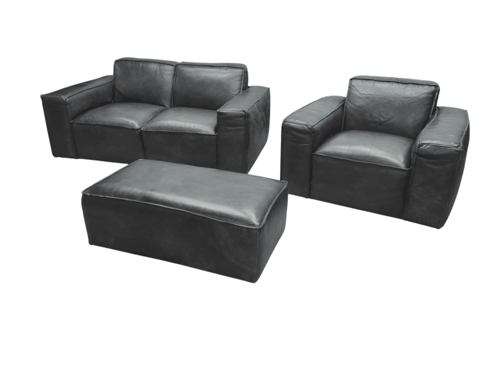 Refurbished charcoal grey leather sofa set with 2 seater, armchair, and footstool. Soft genuine leather, very good condition with minor marks. Comfortable, stylish, and ready for fast delivery with 7-day warranty.