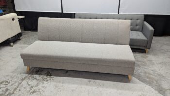 Brand new beige and oak click clack sofa bed with built-in storage and easy folding mechanism. Practical for guests or small spaces. Size: 192cm wide. £250 each. Viewing and delivery available. Includes 7-day warranty.